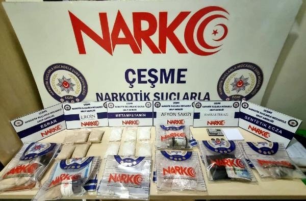 İl Emniyet Müdürlüğü Çeşme Narkotik Büro Amirliği ekipleri, ilçedeki evde uyuşturucu bulunduğu bilgisiyle adrese operasyon düzenledi. Operasyonda 510,81 gram eroin, 210,81 gram metamfetamin, 4,55 gram esrar, 8 sentetik ecza, 1 hassas terazi ve 5 bin 580 euro ele geçirildi. M.A. ve A.S. gözaltına alındı. İşlemlerinin ardından adliyeye sevk edilen 2 kişi, çıkarıldığı hakimlikçe tutuklandı.