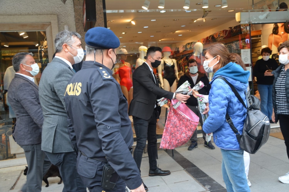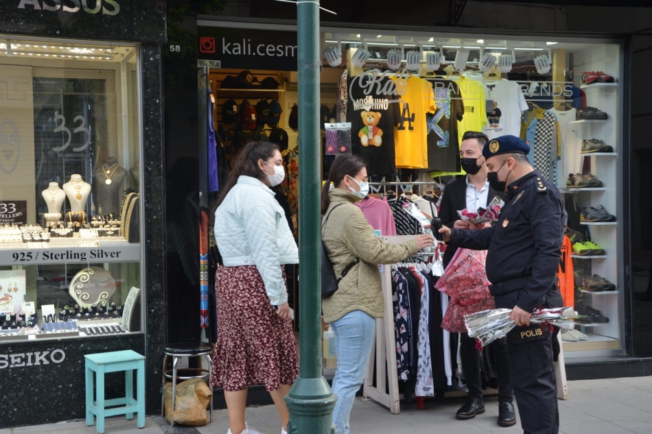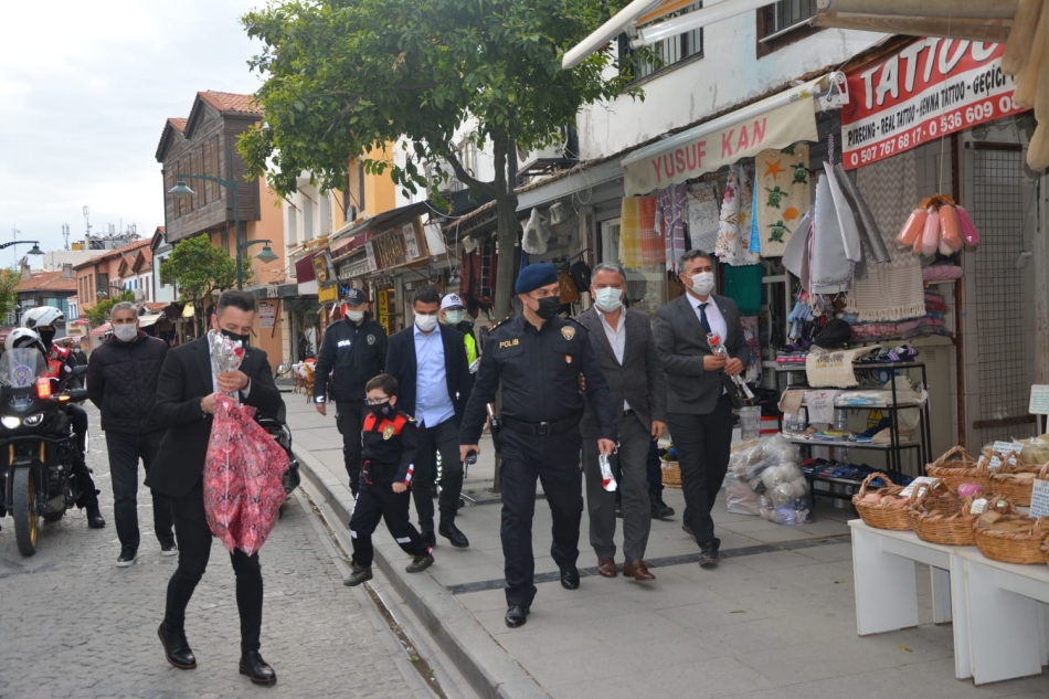 Türk Polis Teşkilatının kuruluşunun 176. yılı nedeniyle Çeşme'deki ilk etkinlik dün yapıldı. İlçe Emniyet Müdürü Gürcan Alev ve bir grup polis, Çeşme Kaymakamı Ünal Çakıcı ve Esnaf Sanatkarlar Odası Başkanı Osman Köfüncü'nün katılımıyla esnaf ziyaretleri gerçekleştirildi. Çeşme Inkılap Caddesi'ndeki tüm esnafın dükkanına giren polisler, çalışmalarında kendilerine katkıları nedeniyle teşekkür etti. Polisler, işyeri sahiplerinin yanı sıra caddedeki kadın ve çocuklara çiçek verdi, ikramda bulundu..