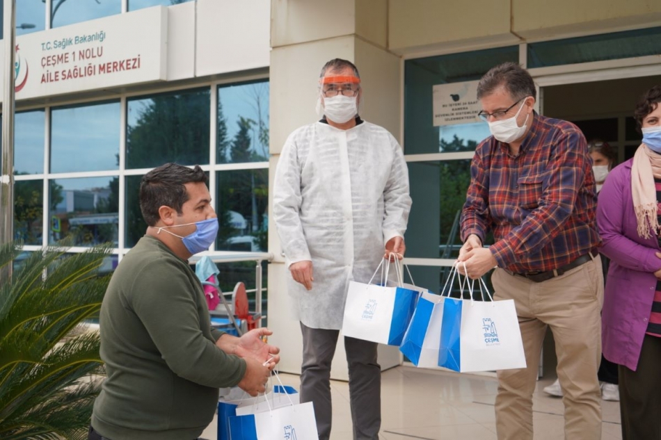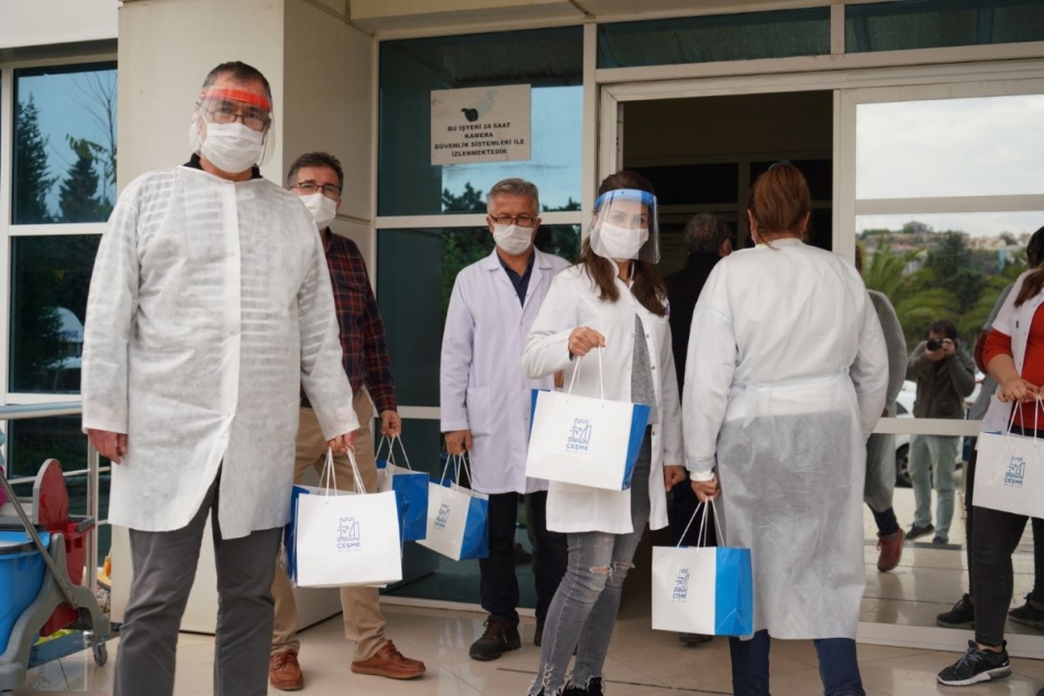 Çeşme Belediyesi Koronavirüs salgınıyla en ön cephede savaşan, canları pahasına gece gündüz demeden mücadele eden sağlık çalışanlarını unutmadı. Çeşme Belediye Başkanı M. Ekrem Oran ilçedeki tüm sağlık çalışanlarına kumanya dağıttı.