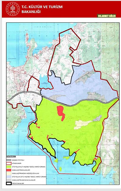 2017 öncesinde yarımadanın neredeyse yarısı 1.derece doğal sit alanı olarak tanımlanmış iken, 2017 yılında nitelikli ve sürdürülebilir koruma alanı olarak değiştirilmiş. Şu anda nitelikli koruma alanı 2157 hektar, sürdürülebilir koruma alanı 2116 hektar. Arkeolojik alan büyüklüğü de 316 hektar. Ayrıca proje alanının dörtte birinden fazlası orman ve bölgenin, karakteristik bitkisi zeytinliklerden oluşan önemli bir tarım rezervi bulunuyor. Proje kara ile de sınırlı kalmamış 47 km’lik kıyıyı ve deniz alanını da kapsayacak şekilde düzenlenmiş. Yani kara yetmemiş, deniz kıyısı da projeye dahil edilmiş.