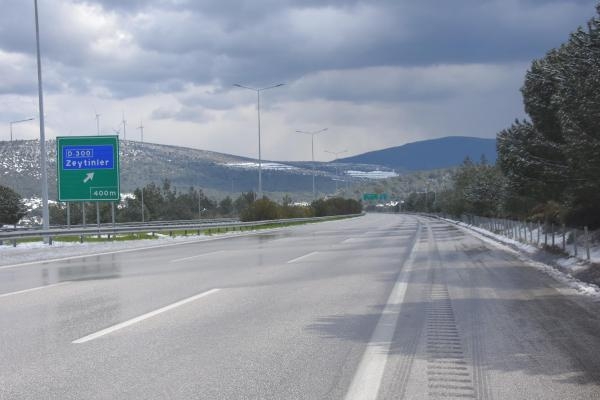 Çeşme'nin yüksek kesimlerinde dün gece saatlerindekar yağışı etkili oldu. Yağışı nedeniyle İzmir-Çeşme Otoyolu'nun Zeytinlik mevkisi beyaza büründü. Karayolları Bölge Müdürlüğü ekipleri otoyolda tuzlama ve küreme çalışmaları yaptı. Kayganlaşan otoyolda maddi hasarlı kazalar meydana geldi. Ekiplerin küreme ve tuzlama çalışmalarının devam ettiği bildirildi.