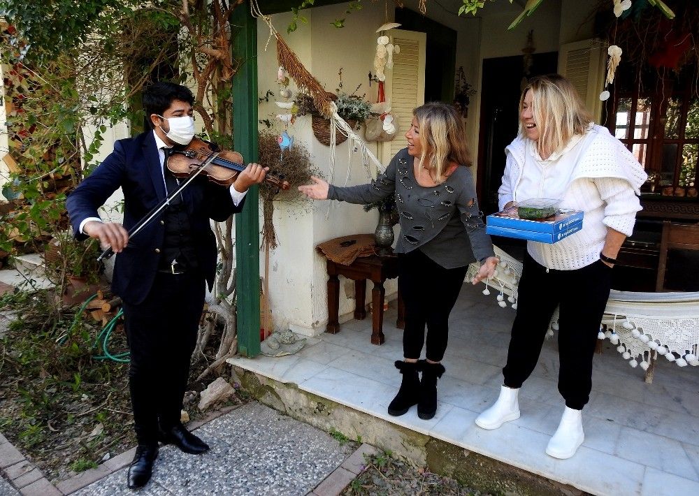 İzmir'in Çeşme ilçesinde bir işletme, Sevgililer Günü'nde keman eşliğinde şarkılı paket servisi yaptı.