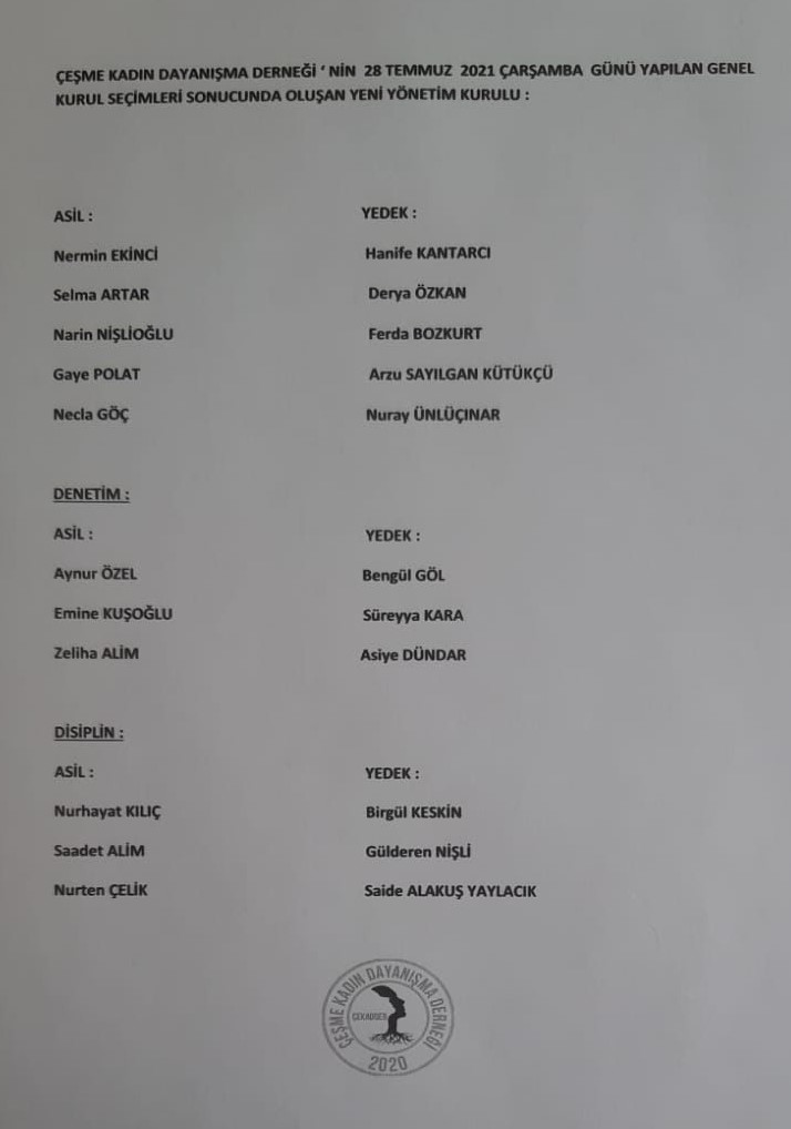 Çeşme Kadın Dayanışma Derneği yönetim kurulu da Selma Artar, Narin Nişlioğlu, Gaye Polat ve Necla Göç'ten oluştu. Birlik ve beraberlik içinde demokrasinin en güzel örneğini veren dernek üyeleri oylarını kullandıktan sonra dilek ve temennilerini paylaştılar. Nermin Ekinci ve yönetim kurulu üyelerini tebrik ettiler. Genel kurul sonrasında bir konuşma gerçekleştiren Başkan Nermin Ekinci, “Değerli ÇEKADDER Üyeleri Genel Kurulumuzu bütün arkadaşlarımla beraber başarıyla tamamlamanın gururunu yaşamaktayım. Hepinize tek tek teşekkür ediyorum. Bana ve arkadaşlarıma gösterdiğiniz bu güvene layık olacağımızdan hiç şüpheniz olmasın. Ben ve arkadaşlarım emin olunuz ki bunun bilincindeyiz” dedi.