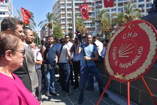 Cumhuriyet Meydanı'ndaki törene CHP milletvekilleri, İzmir Büyükşehir Belediye Başkanı Tunç Soyer, CHP İl Başkanı Deniz Yücel, belediye başkanları, partililer ve vatandaşlar katıldı. Program kapsamında Atatürk Anıtı'na çelenk konuldu, saygı duruşunda bulunulup, İstiklal Marşı okundu.