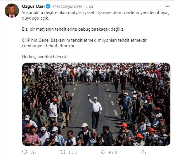 CHP Grup Başkanvekili Özgür Özel: “Susurluk’ta deşifre olan mafya-siyaset ilişkisine derin devletin yeniden ihtiyaç duyduğu açık. Biz, bir mafyanın tehditlerine pabuç bırakacak değiliz. CHP’nin Genel Başkanı’nı tehdit etmek, milyonları tehdit etmektir, Cumhuriyeti tehdit etmektir. Herkes, haddini bilecek!”