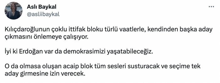 Kemal Kılıçdaroğlu'nun adaylığını eleştiren Aslı Baykal paylaşımında, Cumhurbaşkanı Erdoğan'a övgü dolu sözler sarf etti. Kılıçdaroğlu'nun seçime tek aday gitmek için uğraştığını belirten Baykal, Erdoğan'ı ise demokrasiyi benimseyen bir lider olarak ifade etti.