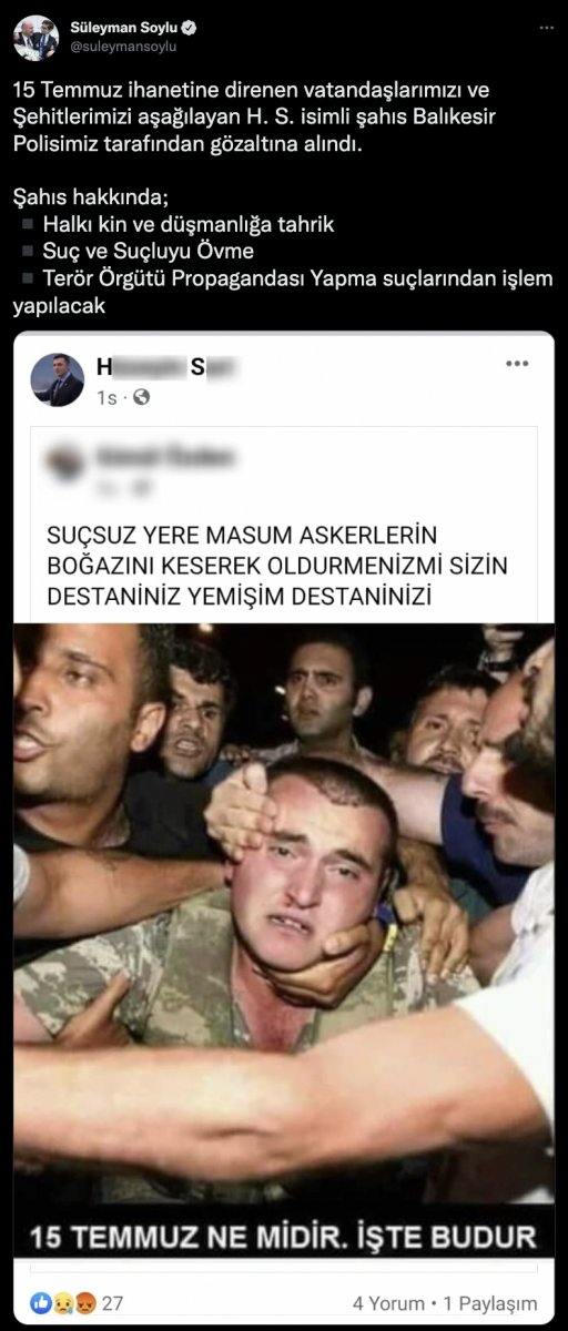 Bakan Soylu, iletisinde, "15 Temmuz ihanetine direnen vatandaşlarımızı ve şehitlerimizi aşağılayan H.S. isimli şahıs, Balıkesir polisimiz tarafından gözaltına alındı. Halkı kin ve düşmanlığa tahrik, suç ve suçluyu övme, terör örgütü propagandası yapma suçlardan hakkında yasal işlem başlatıldı" şeklinde bilgi verdi.