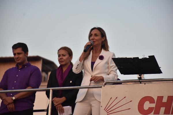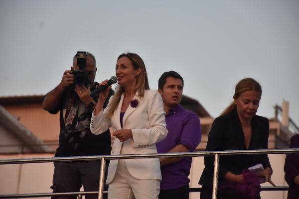 İZMİR'de kadına şiddet ve kadın cinayetlerine tepki göstermek amacıyla düzenlenen etkinliğe katılan CHP Kadın Kolları Başkanı Aylin Nazlıaka, "Buradan kadınların yediğine, içtiğine, giydiğine, kaç çocuk doyuracağına, yaşam tercihlerine, sürdüğü rujun rengine, saçının modeline, başı bağlı mı açık mı diye ayrımcılık yapanlara kırmızı kart gösteriyoruz" dedi.