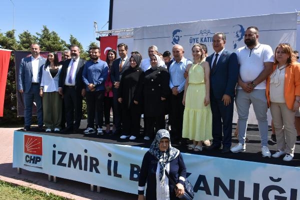 CHP Genel Başkanı Kemal Kılıçdaroğlu'nun geçen ayki İzmir programında partiye 3 bin kişinin katılmasının ardından bugün de 1550 kişi için katılım ve rozet töreni gerçekleşti. Alsancak Tarihi Havagazı Fabrikası'ndaki programa, CHP Genel Başkan Yardımcısı Oğuz Kaan Salıcı'nın yanı sıra İzmir Büyükşehir Belediye Başkanı Tunç Soyer, PM üyesi ve İzmir Milletvekili Ednan Arslan, PM Üyesi Devrim Barış Çelik, CHP İzmir Milletvekili Bedri Serter, CHP İzmir İl Başkanı Deniz Yücel, Konak Belediye Başkanı Abdül Batur, Bornova Belediye Başkanı Mustafa İduğ, Menderes Belediye Başkanı Mustafa Kayalar, Narlıdere Belediye Başkanı Ali Engin, Karşıyaka Belediye Başkanı Cemil Tugay, il yöneticileri ve partiye katılan yeni üyeler katıldı.