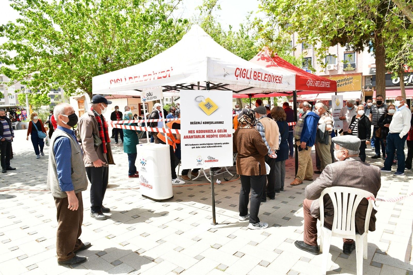 Çiğli Belediyesi, Kasaplar Meydanı'nda kurulan standa HES kodlarıyla gelen vatandaşlara karekodlu anahtarlık hediye etmeye başladı. Görevli personeller, anahtarlık almak için standa gelen vatandaşlara sosyal mesafe, maske ve hijyen kurallarına dikkat etmeleri konusunda sık sık uyarılarda bulundu. Beş dakika gibi kısa bir süre içerisinde anahtarlıklarını alan vatandaşlar, kendilerine büyük kolaylık sağlayacağını ifade ettikleri bu uygulama için Çiğli Belediyesine teşekkür etti.