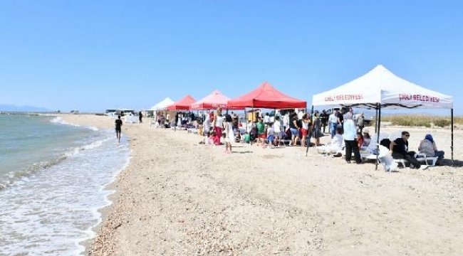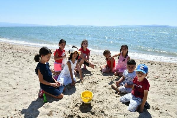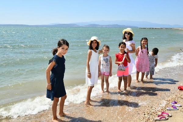 İZMİR'in Çiğli ilçesinde, belediyenin, 'Çiğli'yi Denizle Buluşturma' çalışmaları kapsamında Çiğlili kadın ve çocuklar ilk kez Homa Dalyanı sahilinde denize girdi.