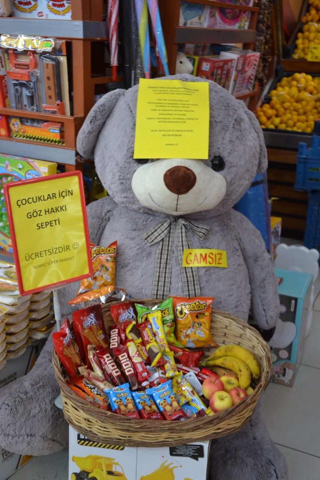 Göz hakkı reyonu yanında bulunan oyuncak ayı Gamsız'dan da çocuklar için bir de mesaj yer alıyor. Mesajda, "Sepetimden çikolata ve meyve alabilirsiniz. Size hediyemdir. Ama size tavsiyelerim var. Hediyelerimi ve yemeğinizi yedikten sonra ellerinizi ve ağzınızı yıkayın. Anne ve babanızın sözünü dinleyin. Derslerinize iyi çalışın. Doğayı, hayvanları, vatanınızı, dininizi ve bütün insanları sevin. Sevgi, mutluluk ve sağlıkla kalın. Sizi seviyorum" ifadeleri yer alıyor.