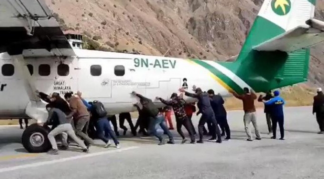 Nepal’in Kolti bölgesinde bulunan Bajura Havaalanında sıra dışı anlar yaşandı. Lastiği patlayan uçak, yolcular tarafından itilerek pist dışına çıkarıldı, görüntüler sosyal medyada viral oldu.