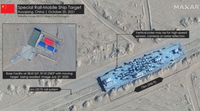 Uydu görüntüleri, Taklamakan Çölü'nde yeni hedef menzil kompleksi gibi görünen bir yerde ABD'nin bir uçak gemisi ile en az iki Arleigh Burke sınıfı güdümlü füze destroyerinin tam ölçekli maketlerinin inşa edildiğine işaret ediyor. Görüntülerdeki gemi boyutunda bir hedef monte edilmiş 6 metre genişliğinde ray sistemi, uzmanlara göre hareket halindeki bir gemiyi simüle etme amaçlı olabilir.