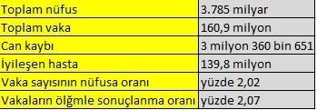 Yeni tip koronavirüs (Covid-19) küresel bir sağlık tehdidi olmaya devam ediyor. Ülkeler virüsle mücadelede toplumsal düzeyde önlemler alarak salgını sonlandırmaya çalışıyor. Hal böyleyken salgının nüfusa etkisi rakamlarla ortaya çıkarıldı. Pandeminin başından beri dünya genelinde vaka sayısı bugün itibarıyla 161 milyon 900 oldu. Güncel verilere göre dünyada 3 milyon 360 bin 651 kişi virüs sebebiyle hayatını kaybetti. Vakaların yüzde 2,07'si ölümle neticelendi.