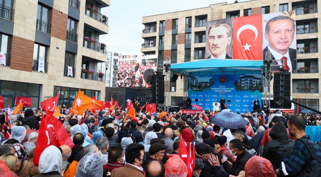 Kürsüye alanı dolduran AK Partililerin büyük tezahüratları eşliğinden çıkan Erdoğan, “Maşallah bir taraftan rahmet bir taraftan millet. Sevgili İzmirliler, sizleri en kalbi duygularımla, hasretle selamlıyorum. Sözlerimin hemen başında İzmir depreminde hayatını kaybeden 117 vatandaşımızı bir kez daha rahmetle yad ediyor, ailelerine baş sağlığı diliyorum. rabbim ülkemizi bu tür afetlerden muhafaza eylesin diyorum. Depremin ilk anından itibaren devlet olarak afetzedelerin yanında olduk. Sadece İzmir’in acısını paylaşmakla kaldık dertlerini çözecek adımlar da attık. Ülkemiz dünyanın en hızlı afet müdahale sistemine sahiptir. Avrupa ve ABD gibi gelişmiş ülkeler başta olmak üzere pek çok yerde yaşanan felaketin ardından aylarca yardım bekleyenlerin olduğunu biliyoruz. Biz ise dakikalar içinde arama kurtarma faaliyetlerini başlatabiliyoruz. Yılı dolmadan da yıkılanların yerine yenisini inşa edebiliyoruz. İzmir’de de bu mekanizmayı ilettik. Depremzedelerin yaralarını sarmak için gece gündüz çalıştık, kimseyi aç ve açıkta bırakmadık. Kaybettikleri canların ve yıkılan evlerinin acısını yaşayanları ilave sıkıntılara sokmadan her meselelerini çözdük. Daha önce Elazığ ve Malatya’da yıkılanların yerini daha iyisini inşa ettiysek İzmir’de de aynısı yaptık. Bayraklı'da yerinde bin 301 dükkan ve 302 dükkan, rezerv alanda 3 bin 649 konut 511 dükkan inşa etmek için hemen harekete geçtik. Bornova’daki 34 köy eviyle birlikte İzmir depreminin ardından 5 bin 74 konut ve 354 konut yapma kararı aldık. 1 yılda teslim etmeye başlama sözü verdik. Bugün sözümüzü tutuyor ve ilk etap konut ve dükkanları depremzedelere teslim ediyoruz. Bizler AK Partiyiz, bizler söz veririz, sözümüzü tutarız. Adalet, Mavavkuyu, Mansuroğlu mahallerine yayılan projelerdeki konut ve dükkanlar biraz sonra sahipleriyle buluşacak” diye konuştu.