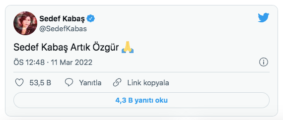 Tahliye edilen Kabaş, karar sonrasında sosyal medya hesabından "Sedef Kabaş artık özgür" paylaşımında bulundu.