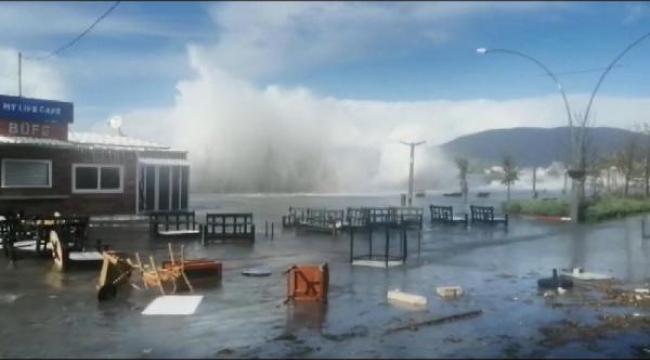 BALIKESİR'in Erdek ilçesinde kuvvetli rüzgar, hayatı olumsuz etkiledi. Boyu 5 metreye ulaşan dalgalar, balıkçı motorları ile teknelere zarar verdi.
