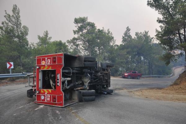 Öte yandan takviye olarak bölgeye gönderilen arazözlerden biri virajda devrildi. Arazözün sürücüsü ve içindeki bir orman işçisi kazayı yara almadan atlattı.