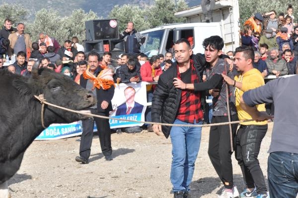 Muğla Büyükşehir Belediyesi Kupası final müsabakasına Milas ilçesinden katılan Kahraman Akar'ın (36) 'Çapraz' isimli boğası ile Bozarmut'tan 43 yaşındaki Erkan Uslu'nun 'Ölüm Makinesi' isimli boğası mücadele etti. Güreşte, 'Ölüm Makinesi' isimli boğanın sol boynuzunun kabuğu sıyrıldı. Hakemlerin müdahalesi ile mücadele yarıda kesilerek, 'Çapraz' isimli boğa galip ilan edildi. Bu sırada, babası Erkan Uslu ile birlikte güreşte görevli olan 15 yaşındaki oğlu Emirhan Uslu boğası 'Ölüm Makinesi'nin boynuzunu görünce kısa süreli baygınlık geçirdi. Zorlu mücadeleyi kazanan boğanın sahibi, güreş sonrası büyük bir centilmenlik örneği sergiledi. Rakibinin boynuz kabuğunun sıyrılması nedeniyle yarıda kalan güreşte galip ilan edilen boğa sahibi Kahraman Akar, kazandığı kupayı 'Ölüm Makinesi' isimli boğanın sahibi Erkan Uslu'ya verdi. Bu davranış alanı dolduran yüzlerce kişi tarafından coşkuyla alkışlandı.