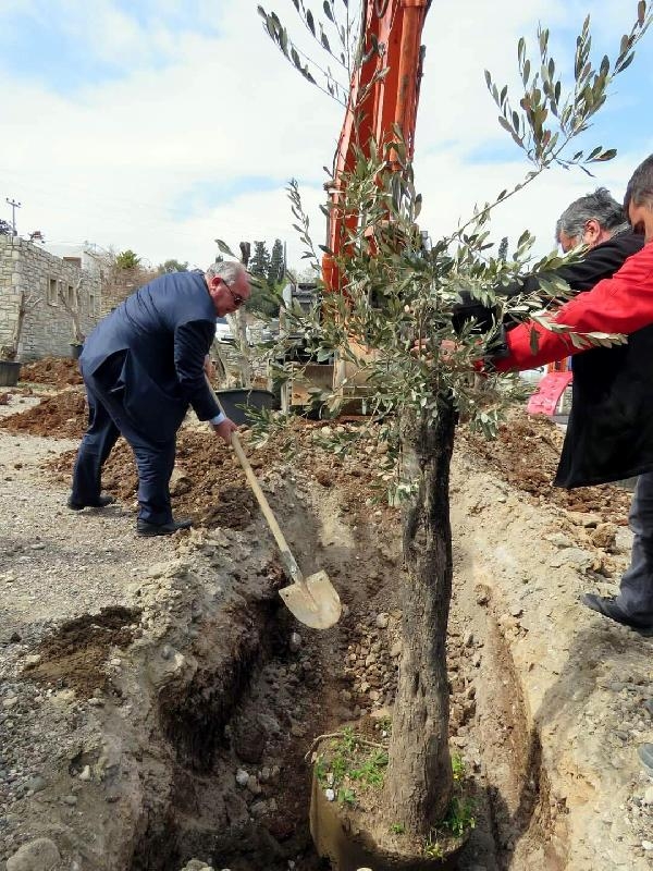 Başkan Uçar'ın konuşmasının ardından 20 zeytin ağacı toprakla buluşturuldu. (DHA)