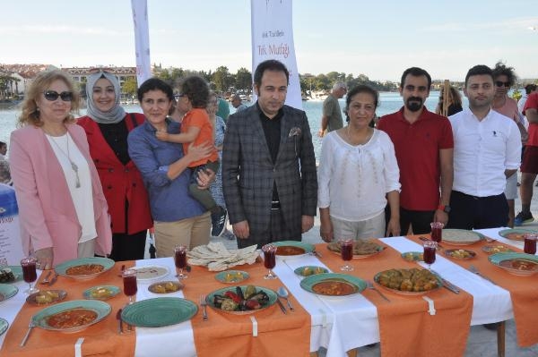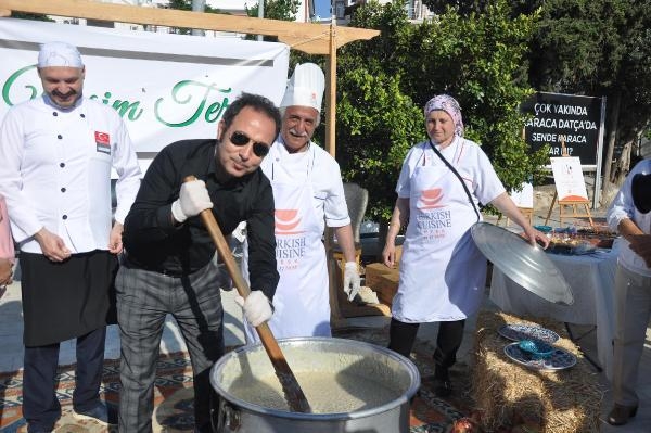MUĞLA'nın Datça ilçesinde, Türk Mutfağı Haftası kapsamında düzenlenen etkinlikte, katılımcılara tarhana çorbasından kuru fasulyeye, keşkekten kabak çiçeği dolmasına kadar çeşitli yemekler ikram edildi.