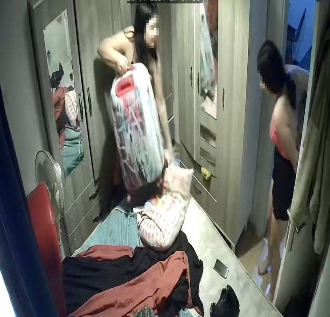 Öte yandan hırsızlık anı ise an be an güvenlik kamerasına yansıdı. Görüntülerde, mini etekli dekolte giyimli iki kadının açılan kapıdan içeri girmeleri, etrafı incelemeleri, oyuncak köpekle kamerayı kapatmaya çalıştıkları görüldü. Evde rahat tavırlarıyla dikkat çeken iki hırsız, uyuyan çocuğun elinden telefonu alıp, orada oturup sohbet ettikleri gözlemlendi. Aldıkları telefonu karıştıran hırsızların, İskoç cinsi kediyi kucağına alıp sevdiği ve valizi açtığı anlar kameraya yansıdı.