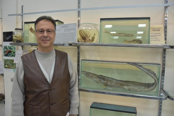 Türkiye'de sergilenen kılıç dişli yılan balığı hakkında bilgi veren Prof. Dr. Tanrıkul, "Bu tür Ekim 2020'de getirildi. Antalya kıyılarında bir balıkçı tarafından avlanılarak müzemize hediye edildi. Kızıldeniz'den Akdeniz'e gelen bir tür. Üniversitemiz bünyesinde bu türün bilimsel çalışmaları yapıldı. Bu balığın aslı Pasifik Okyanusu'nda bulunuyor. Daha sonra Kızıldeniz'e yerleşmiş. Bu balık sık karşılaşılan bir tür değil. Bu balığın aslı sadece bizim fakültemizdeki merkezde sergileniyor. Bu tür, müren ve kongar yılan balığı arasında bulunan bir canlı. Şimdiye kadar birkaç tane çıkmış. Bir tanesi de bizim merkezimizde sergileniyor. Bu balığın kongar gibi ince ve kaygan bir derisi, müren balığı gibi dişleri bulunuyor. Bu yüzden bu balığa bir ara tür olarak bakıyoruz. Ülkemizde yalnızca üniversitemizde sergileniyor ve bu tür eğitim amaçlı tanıtılıyor" ifadelerini kullandı.