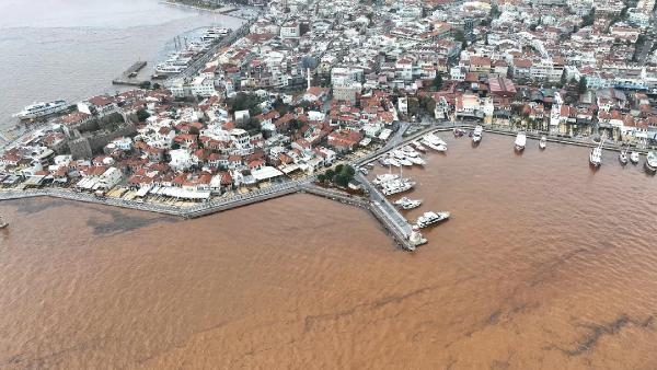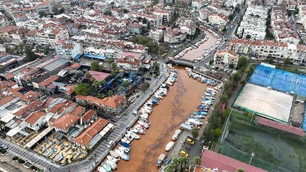 Muğla'nın Marmaris ilçesinde etkili olan sağanak ve fırtına nedeniyle tepelerden gelen çamurlu su nedeniyle Yat Limanı, Atatürk Bulvarı ile Kısayalı Sahili kahverengiye döndü. Denizin kahverengiye dönen alanlar havadan görüntülendi. (DHA)