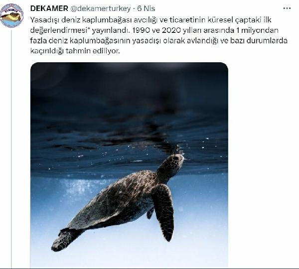 MUĞLA'nın İztuzu Plajı'nda faaliyetini sürdüren Deniz Kaplumbağaları Uygulama ve Araştırma Merkezi (DEKAMER), yapılan çalışmalar sonucu Global Change Biology dergisinde yayınladığı raporu Twitter hesabından paylaştı. Raporda, 1990-2020 yılları arasında 1 milyondan fazla yeşil ve atmaca gagalı deniz kaplumbağasının kabukları için yasa dışı avlandığını ve kaçırıldığı bilgisine yer verildi.