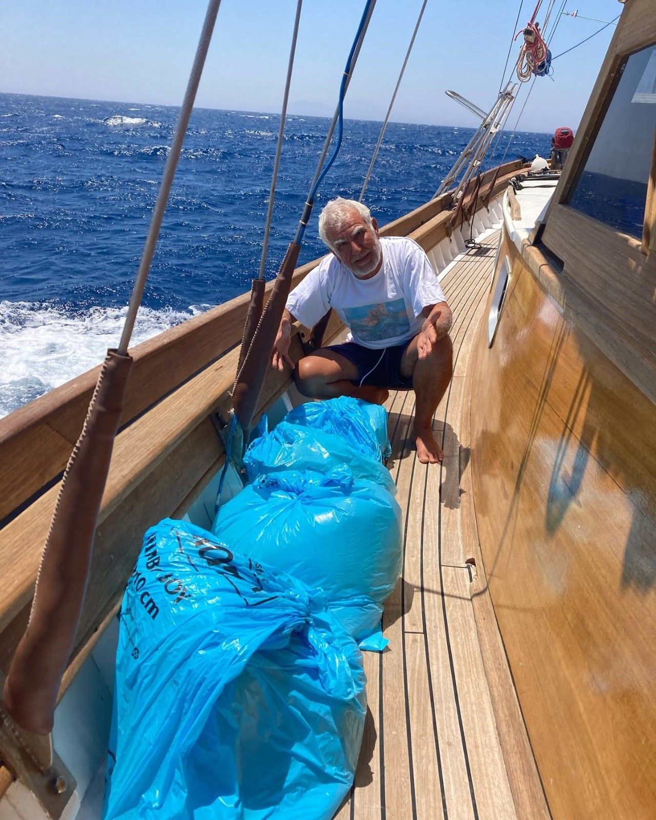 Teknesi ile misafirlerini mavi tura çıkaran Aksona Mehmet lakaplı 72 yaşındaki Mehmet Baş, Oraklar'dan Karaada'ya seyrederken denizin ortasında büyük boy dolu çöp torbaları ile karşılaştı.