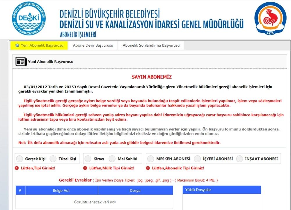 Vatandaşlar ev ya da işyerlerinden yapacağı online başvuru ile abonelik işlemleri, abone devir işlemleri, abonelik iptal işlemleri, güvence bedeli işlemleri, su açma kapatma işlemleri, endeks işlemleri, fatura işlemleri, tarife işlemleri, abone bilgi güncelleme işlemleri, sayaç bildirim işlemleri, mühürleme ve plaka işlemleri gibi hizmetleri alabiliyor. Online müracaatın ardından Denizli Büyükşehir Belediyesi DESKİ ekipleri vatandaşların ayağına kadar giderek söz konusu başvuru işlemlerini tamamlıyor.
