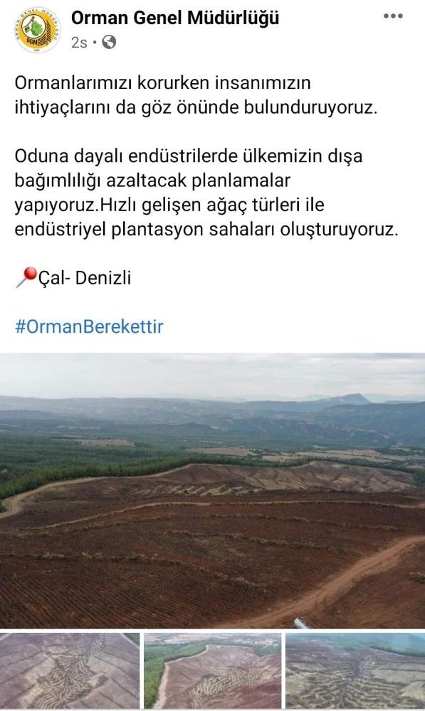 Orman berekettir etiketiyle paylaşımda bulunan Orman Genel Müdürlüğü, "Ormanlarımızı korurken insanımızın ihtiyaçlarını da göz önünde bulunduruyoruz. Oduna dayalı endüstrilerde ülkemizin dışa bağımlılığı azaltacak planlamalar yapıyoruz. Hızlı gelişen ağaç türleri ile endüstriyel plantasyon sahaları oluşturuyoruz."