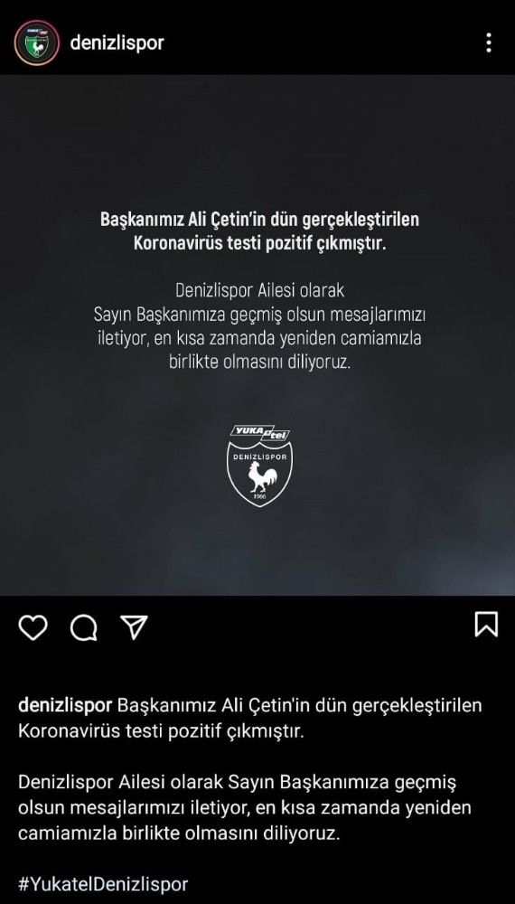 Denizlispor Kulübü, Başkan Ali Çetin'in korona virüs testinin pozitif çıktığını duyurdu.