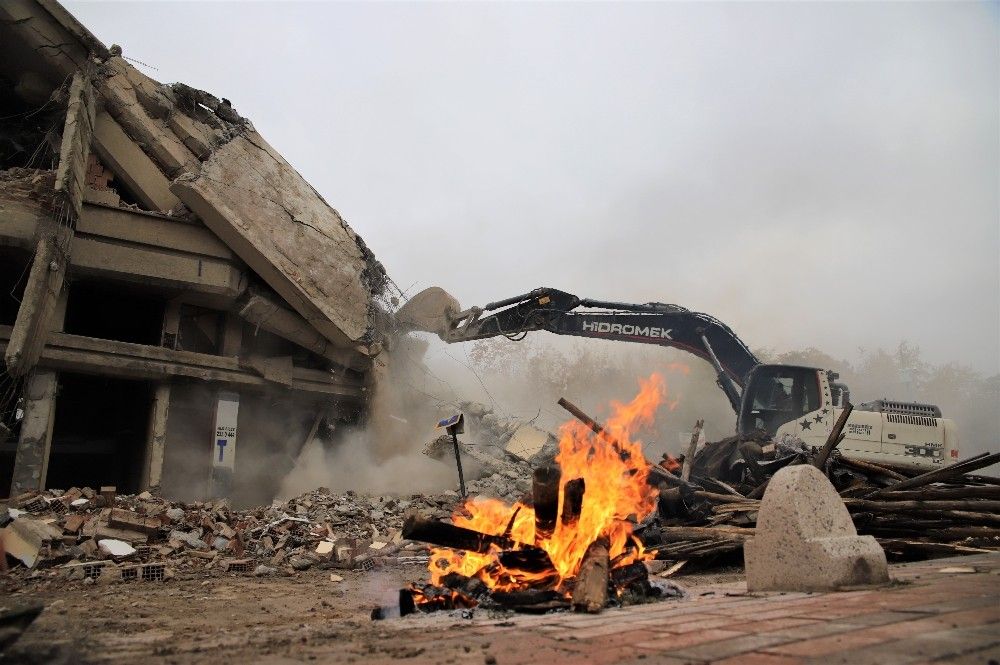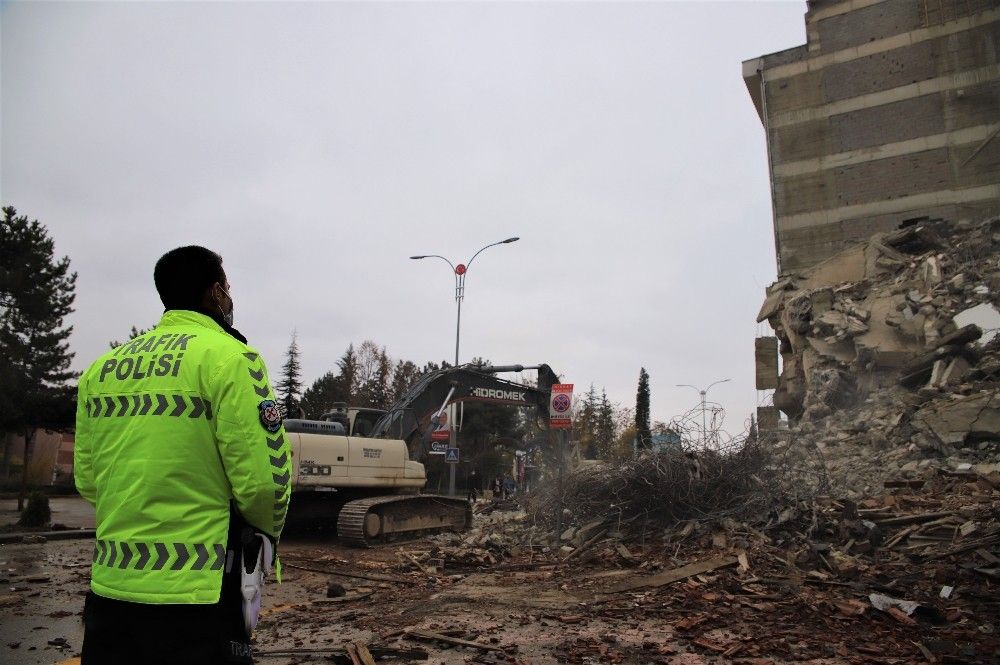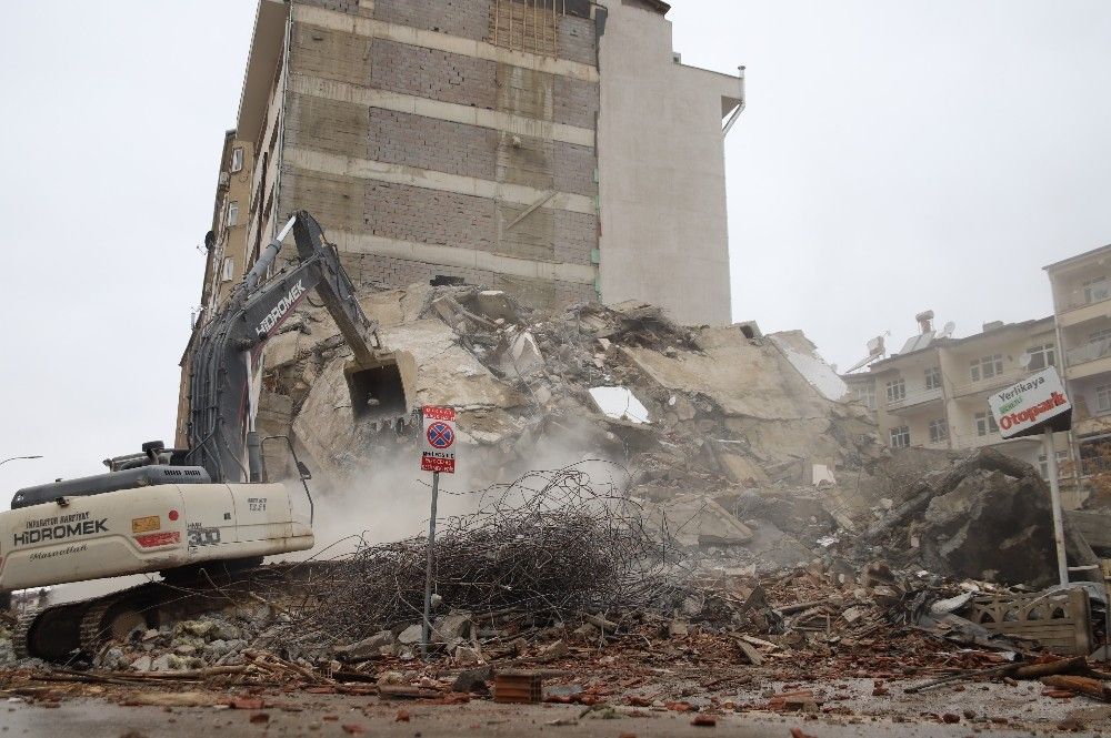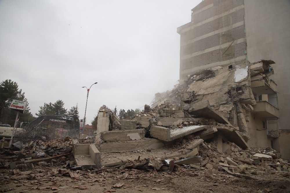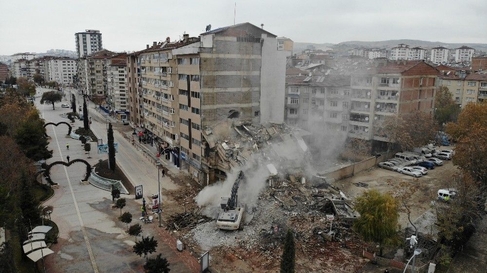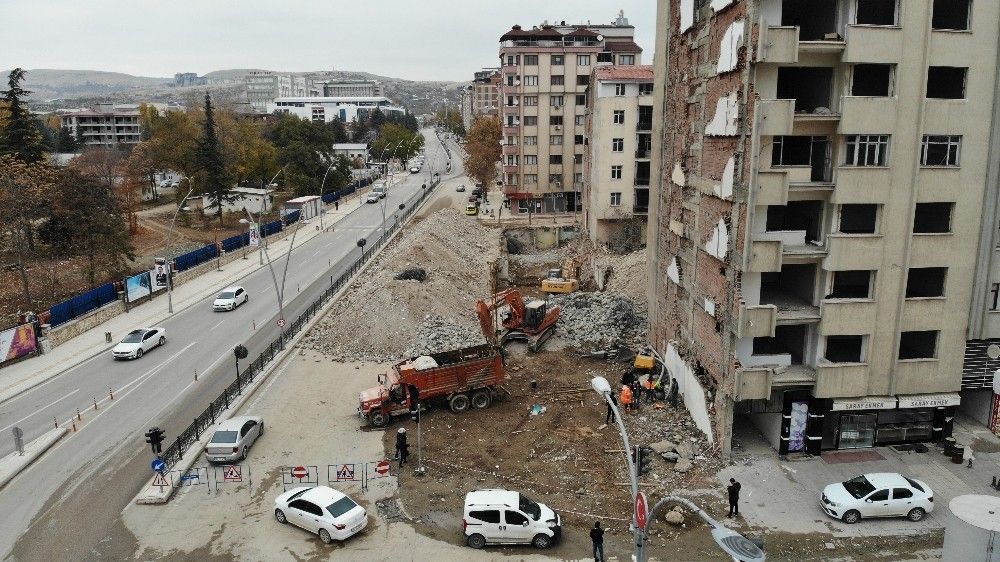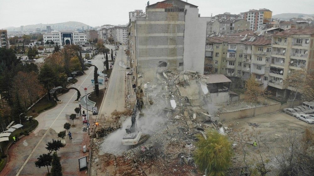 Covid-19 tedbirleri kapsamında hafta sonu uygulanan sokağa çıkma kısıtlamasıyla deprem bölgesi Elazığ'da kent merkezindeki ağır hasar alan binaların yıkımları hız kazandı