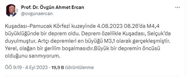 Jeofizik Yüksek Mühendisi Deprem Bilimci Prof. Dr. Övgün Ahmet Ercan ise depremle ilgili sosyal medya hesabından yaptığı paylaşımda, "Kuşadası Pamucak Körfezi kuzeyinde 04.08.2023 08.26'da 4.4 büyüklüğünde bir deprem oldu. Deprem özellikle Kuşadası, Selçuk'ta duyulmuştur. Artçı depremleri en büyüğü 3.1 olarak gerçekleşmiştir. Yerel, olağan bir gerilim boşalmasıdır. Büyük bir depremin öncüsü olduğunu sanmıyorum" ifadelerine yer verdi.