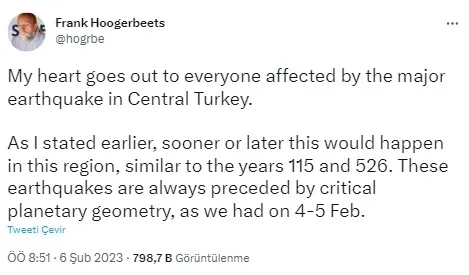 Sabaha karşı 4.17'de Kahramanmaraş'ta meydana gelen ve 11 ilimizi etkileyen depremden acı dolu haberler gelmeye devam ederken, ünlü gökbilimci 'deprem kahini' Frank Hoogerbeets'in 3 Şubat tarihinde attığı tweet sosyal medyada gündem oldu.