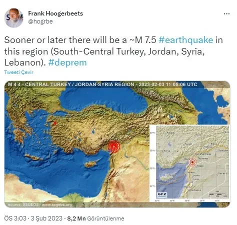 Hoogerbeets 3 Şubat'ta Twitter üzerinden yaptığı paylaşımda "Er ya da genç bu bölgede (Güney-Orta Türkiye, Ürdün, Suriye, Lübnan) 7.5 şiddetinde deprem olacaktır" sözlerine yer vermiş.