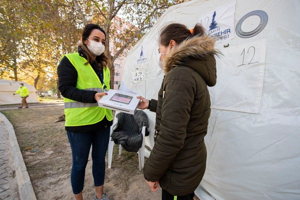 Büyükşehir ekipleri, tabletlerin dağıtımına Bayraklı bölgesinden başladı. Bilal Çakırcalı Parkındaki çadır kentte yaşayan 12. sınıf öğrencisi Zeynep Ay, üç haftadır uzaktan eğitime katılamadığını söyleyerek Büyükşehir'e tablet desteği için teşekkür etti. Depremde evi ağır hasar gördüğü için yeni bir eve taşınan Özlem Ünlü ise iki oğlunun bilgisayar olmadığı için çevrim içi derslere giremediğini söyleyerek, "Büyükşehir Belediyesi'nin tablet desteği vereceğini duyunca hemen başvurumuzu yaptık. Çok teşekkür ediyoruz" şeklinde konuştu.