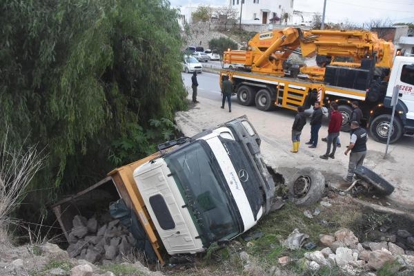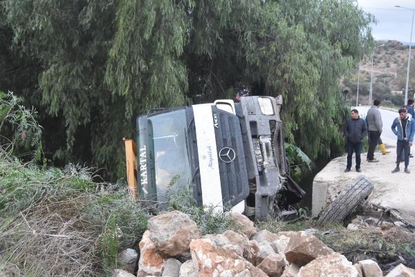MUĞLA'nın Bodrum ilçesinde, sürücüsünün direksiyon hakimiyetini kaybettiği hafriyat kamyonu dere yatağına yuvarlandı. Sürücü yara almadan kurtuldu.