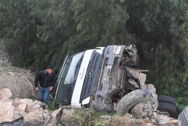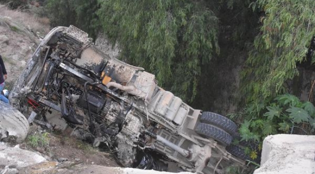 Dere yatağına yuvarlanan kamyondan yara almadan kurtuldu