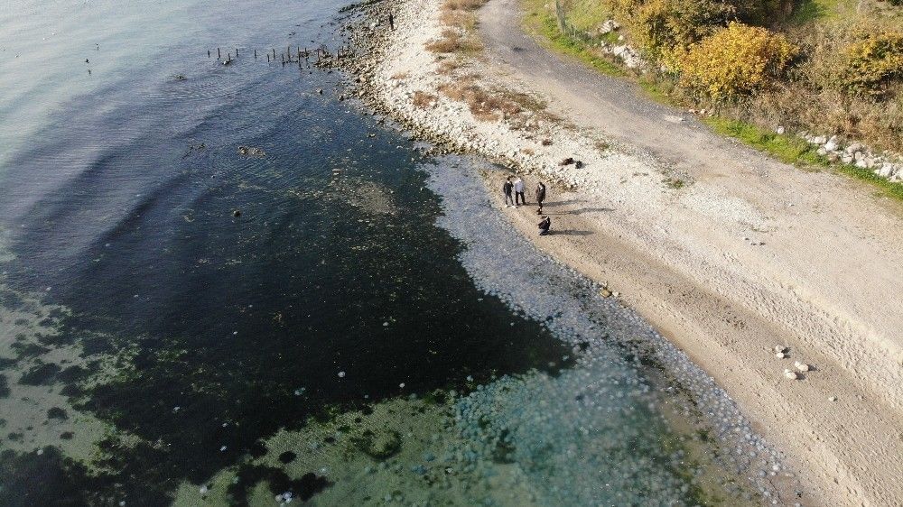 Avcılar Ambarlı Sahili'nde binlerce deniz anası kıyıya vurdu. Deniz anaları havadan da görüntülendi.