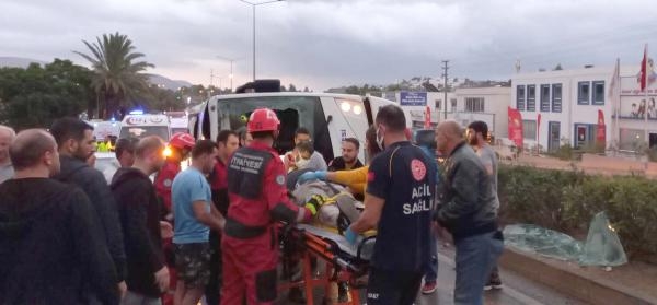 Bodrum ilçesinde refüjü aşıp karşı şeride geçerek devrilen midibüse, otomobil çarptı. Kazada, 3'ü aynı aileden, 4 kişi yaralandı.