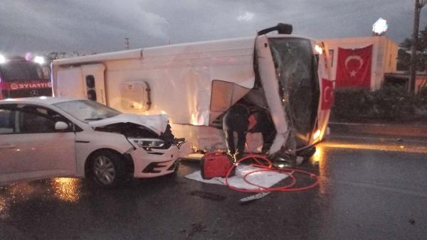 Devrilen midibüse otomobil çarptı: 4 yaralı