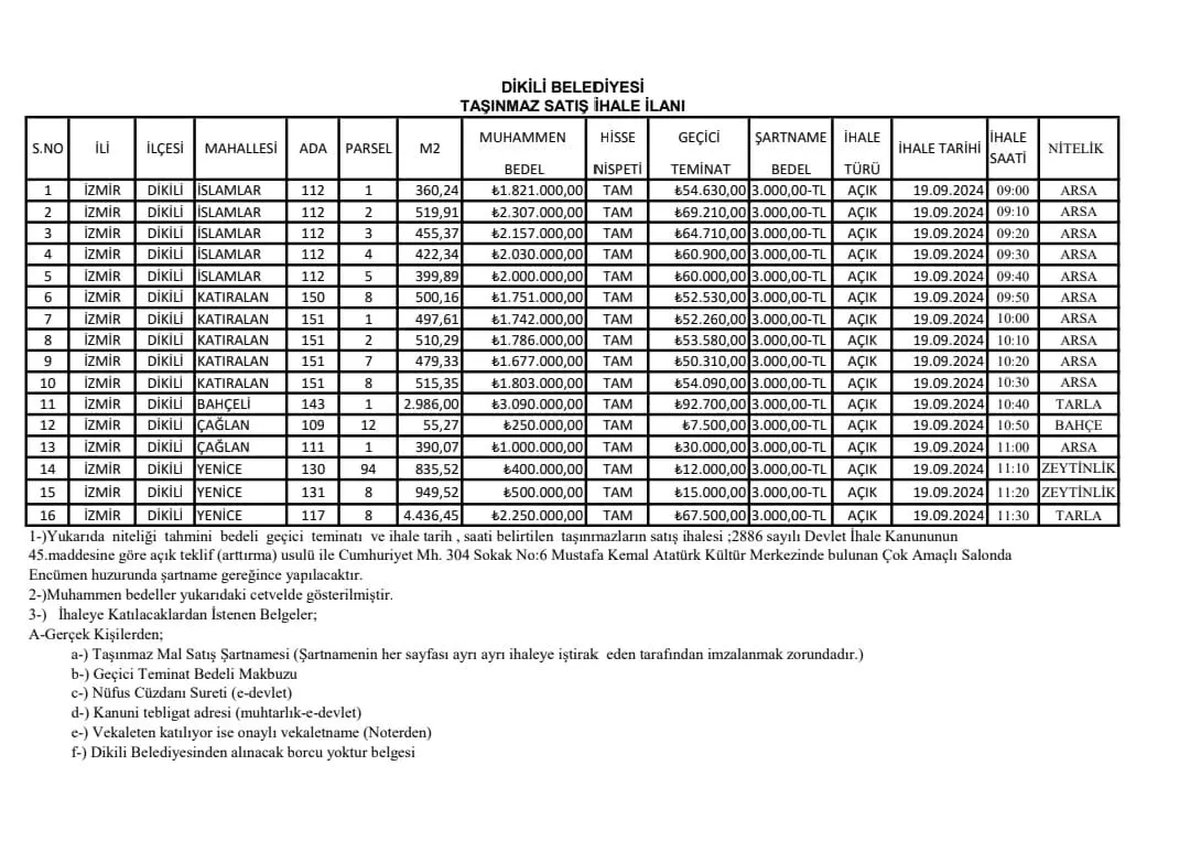 Resmi Gazete’de yer alan ilana göre, Dikili’nin İslamlar, Katıralan, Bahçeli, Çağan, Yenice mahallelerinde mülkiyeti belediyeye ait 16 arsa, bahçe ve zeytinlik nitelikli taşınmaz satışa çıkarıldı.