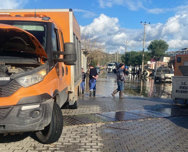 Sülüklü Deresi’nde şiddetli yağış ve lodosun etkisiyle dere yatağındaki suların denize ulaşamamasının taşkına sebebiyet verdiği tespit edildi. Derenin kapalı kesit haline geldiği noktadan itibaren yaşanan taşkın, Dikili ilçesinin merkezinde bulunan Şehit Sami Akbulut Caddesi ile Cumhuriyet Bulvarı Kavşağı’nda su baskınına neden oldu. Kısa sürede bölgeye ulaşan ve 90 personelden oluşan İZSU ekipleri tarafından bölgedeki sular motorlarla denize deşarj edilerek su seviyesi düşürüldü. Bölgede belediye ekipleri ile birlikte kapsamlı temizlik çalışmaları devam ediyor.