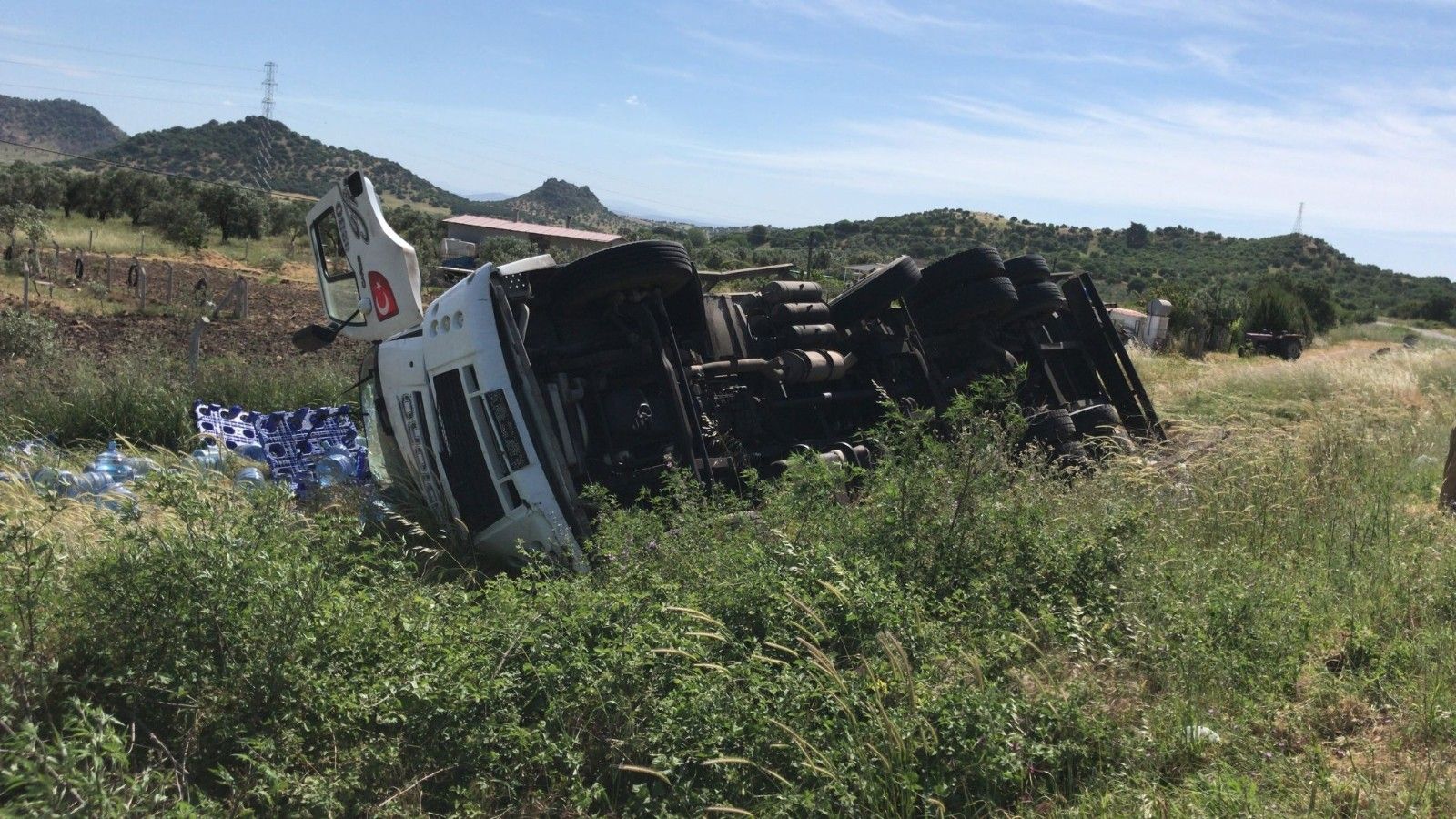 İzmir'in Dikili ilçesinde su damacanası yüklü kamyon hızını alamayarak devrilirken, kazada 2 kişi yaralandı.