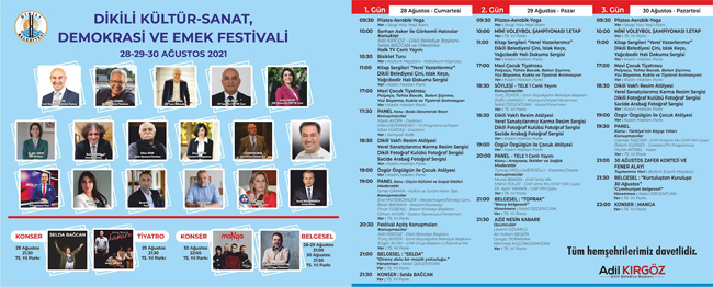 Festival boyunca pilates, aerobik ve yoga etkinliğinin yanı sıra Dikili Belediyesi Çini, Islak Keçe, Yağcıbedir Halı Dokuma sergisi de yer alacak. Çocuklar için palyaço, tahta bacak, balon şişirme, yüz boyama, kukla ve tiyatral animasyonun da olacağı festivalde Tiyatrocu Özgür Özgülgün tarafından çocuk atölyesi yapılacak. Yerel sanatçılar ile Sacide Arabağ’ın fotoğraf sergisi de festivalde yer alacak. Dikili, Kültür - Sanat, Demokrasi ve Emek Festivali’nin ilk gününde Halk TV’de yayınlanan Serhan Asker ile Görkemli Hatıralar canlı yayınına Dikili Belediye Başkanı Adil Kırgöz, Sanatçı Selda Bağcan ve Yazar-Yönetmen Nebil Özgentürk konuk olarak katılacak. Bisiklet turu ve kitap sergisinin de açılacağı festivalde Gazeteciler Yaşar Aydın, İrfan Değirmenci ve Sibel Hürtaş’ın konuşmacı olacağı “Baskı Döneminde Basın” konulu panel gündüz programında yapılırken, CHP Kültür, Sanat ve Turizm Başdanışmanı İsmet Orhan’ın moderatörlüğünde Akademisyen-Strateji Uzmanı Erol Mütercimler, Ressam-Siyasetçi Bedri Baykam, Basın Konseyi Başkanı Pınar Türenç ve Tiyatro Oyuncusu Orhan Aydın’ın konuşmacı olacağı “Göçün Kültürel ve Sosyal Etkileri” konulu panel akşam bölümünde gerçekleşecek. Festivalin açılış konuşmalarını ise Dikili Belediye Başkanı Adil Kırgöz, İzmir Büyükşehir Belediye Başkanı Tunç Soyer, CHP Grup Başkan Vekili-İstanbul Milletvekili Engin Altay yapacak. Dikili, Kültür - Sanat, Demokrasi ve Emek Festivali’nin ilk günü yönetmenliğini Nebil Özgentürk’ün yaptığı “Selda” belgeselinin ardından gerçekleşecek Selda Bağcan konseri ile sona erecek. Festivalin ikinci günü Mini Voleybol Şampiyonası’nın birinci etabı gerçekleşecek. TELE1’in canlı yayın yapacağı söyleşide ise İzmir Büyükşehir Belediye Başkanı Tunç Soyer, Müzisyen-Yazar-Yönetmen Zülfü Livaneli, Yazar-Yönetmen Nebil Özgentürk yer alacak. Moderatörlüğünü Gazeteci-Yazar Tuncay Mollaveisoğlu’nun yapacağı “Anayasa, İktidar ve Sağlık” konulu panelin konuşmacıları ise CHP İzmir Milletvekili Murat Bakan, CHP İzmir Milletvekili-YDK Üyesi Mahir Polat ve CHP PM Üyesi Dr. Aylin Yaman olacak. Belgesel kuşağında da yönetmenliğini Nebil Özgentürk’ün yaptığı “Toprak” belgeseli yayınlanacak. Festivalin ikinci gününde son etkinlik Levent Üzümcü, Ali Hakan Beşen, Cengiz Toraman ve Mehmet Küçükgünaydın sahne aldığı “Aziz Nesin Kabare” oyunu olacak. Dikili, Kültür - Sanat, Demokrasi ve Emek Festivali’nin son günü Mini Voleybol Şampiyonasıyla başlayacak. “Türkiye’nin Kayıp Yılları” konulu panelde CHP Ankara Milletvekili-PM Üyesi Gamze Taşcıer, Gazeteci-TV Programcısı Özlem Gürses ve Yazar Murat Ağırel yer alacak. 30 Ağustos Zafer Korteji ve Fener Alayı’nın da gerçekleşeceği festivalde Nebil Özgentürk yönetmenliğinde “Kurtuluştan Kuruluşa 30 Ağustos” belgeseli yayınlanacak. Festival Manga konseriyle son bulacak.