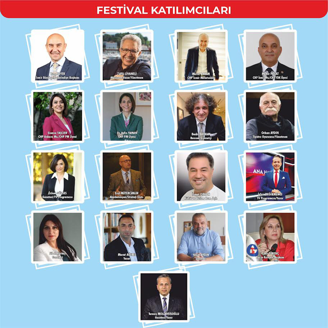 Spordan sanata, konserlerden panellere birçok etkinliğin gerçekleşeceği festivalde birbirinden önemli isimler de yer alacak. CHP Grup Başkanvekili-İstanbul Milletvekili Engin Altay, İzmir Büyükşehir Belediye Başkanı Tunç Soyer, CHP İzmir Milletvekili Murat Bakan, CHP İzmir Milletvekili-YDK Üyesi Mahir Polat, CHP Ankara Milletvekili-PM Üyesi Gamze Taşcıer, CHP PM Üyesi Dr. Aylin Yaman, Müzisyen-Yazar-Yönetmen Zülfü Livaneli, Yazar-Yönetmen Nebil Özgentürk, CHP Kültür, Sanat ve Turizm Başdanışmanı İsmet Orhan, Ressam-Siyasetçi Bedri Baykam, Tiyatro Oyuncusu-Yönetmen Orhan Aydın, Gazeteci-TV Programcısı Özlem Gürses, Akademisyen-Strateji Uzmanı Erol Mütercimler, TV Programcısı-Yazar İrfan Değirmenci, Gazeteci Sibel Hürtaş, Yazar Murat Ağırel, Gazeteci Yaşar Aydın, Basın Konseyi Başkanı Pınar Türenç, Gazeteci-Yazar Tuncay Mollaveisoğlu vatandaşlarla buluşacak.