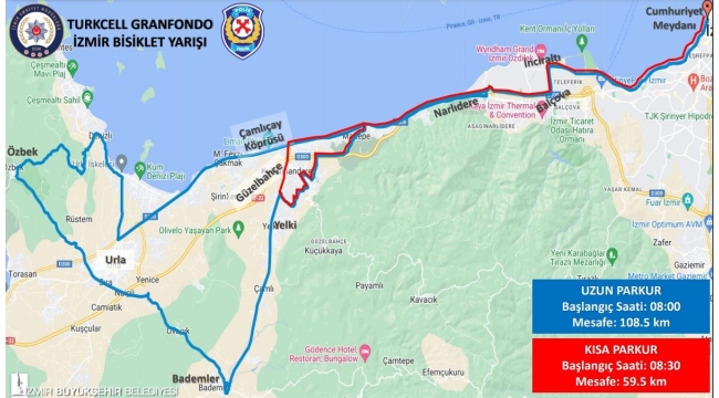 Gençlik ve Spor Bakanlığı’nın onayı ve İzmir Valiliği’nin izniyle 22 Ekim Pazar günü İzmir'de düzenlenecek Turkcell Granfondo İzmir 2023 Bisiklet Yarışı kapsamında, Konak’tan Urla’ya kadar uzanan rota, yarış saatlerinde trafiğe kapatılacak. 06.00-15.00 saatleri arasında, bölgedeki ESHOT otobüs hatlarının güzergâhlarında değişiklikler olacak. Üçkuyular Feribot İskelesi ise hizmet veremeyecek.